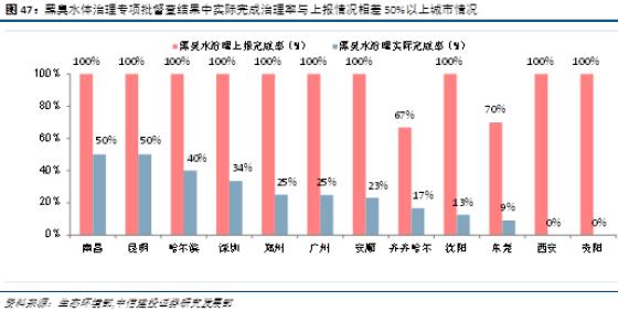 整改目標延期,黑臭水治理任重道遠?!八畻l”中要求,2017年年底前實現(xiàn)直轄市、省會城市、計劃單列市建成區(qū)基本消除黑臭水體,但截至到2018年11月,全國只有13個省市治理完成率達到100%,36個重點城市整體平均完成率只有70%,距離基本消除黑臭水體的要求還很遠。為此,2018年10月16日,住房和城鄉(xiāng)建設部、生態(tài)環(huán)境部聯(lián)合發(fā)布《城市黑臭水體治理攻堅戰(zhàn)實施方案》,將目標改為到2018年年底,直轄市、省會城市、計劃單列市建成區(qū)黑臭水體消除比例高于90%,基本實現(xiàn)長治久清,相較于“水十條”中的要求,完成期限和消除比例的要求均有所放松,也從側(cè)面反映了我國黑臭水情況的嚴重程度和治理難度,治理黑臭水任重道遠。