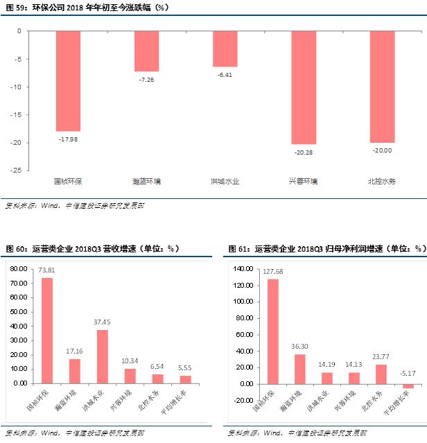 運營資產(chǎn)優(yōu)質(zhì),企業(yè)業(yè)績平穩(wěn)增長。我們選取國禎環(huán)保、瀚藍環(huán)境、洪城水業(yè)、興蓉環(huán)境以及北控水務,分析了自年初以來各企業(yè)的市場表現(xiàn)以及近5年來的運營成績。從市場表現(xiàn)來看,今年環(huán)保板塊從一月份以來整體一路走低,截止至2018年11月29日,中信環(huán)保指數(shù)自年初累計下跌45.70%,滬深300指數(shù)累計下跌22.16%。而五個企業(yè)中最大跌幅的興蓉環(huán)境也只有20.28%,不及環(huán)保板塊整體跌幅的一半,5家運營類企業(yè)均跑過滬深300指數(shù),運營類企業(yè)以其穩(wěn)定的現(xiàn)金流和穩(wěn)健的業(yè)績充分展示其防御性。從經(jīng)營業(yè)績表現(xiàn)來看,5家企業(yè)均表現(xiàn)穩(wěn)定,尤其國禎環(huán)保在經(jīng)歷前兩年的蟄伏期后,2018年前三季度經(jīng)營業(yè)績漲勢突出,營業(yè)收入增速由去年的35.3%上升到今年的73.81%,歸母凈利潤增長率則由去年的15.7%增長到今年的127.68%??梢娫诋斍靶星榈兔缘谋尘跋拢\營類企業(yè)穩(wěn)定的業(yè)績表現(xiàn)亮眼。