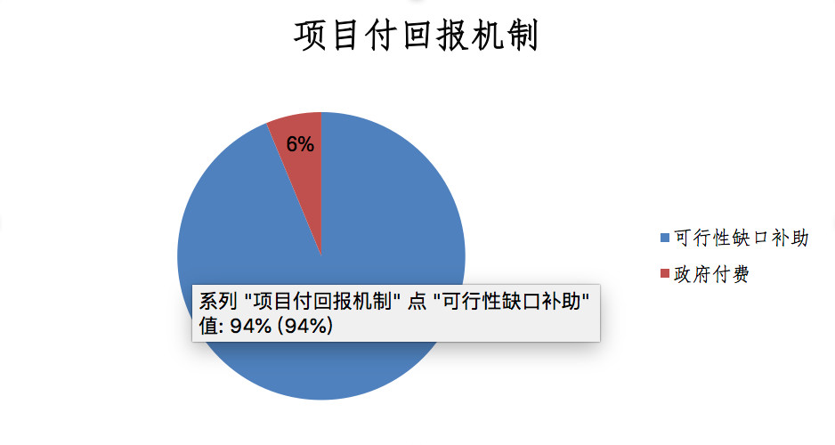 根據(jù)財(cái)政部PPP綜合信息平臺(tái)數(shù)據(jù)顯示,可行性缺口補(bǔ)助類回報(bào)機(jī)制的項(xiàng)目占比最多,為94%,政府付費(fèi)類項(xiàng)目?jī)H占6%,無使用者付費(fèi)類項(xiàng)目。這種情況與目前的PPP政策和項(xiàng)目性質(zhì)特點(diǎn)有直接關(guān)系。