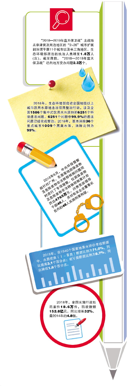 “2018年,全國(guó)實(shí)施行政處罰案件18.6萬(wàn)件,罰款數(shù)額152.8億元,同比增長(zhǎng)32%,是2014年的4.8倍?!?p style="text-indent: 2em;">這一組數(shù)據(jù)是生態(tài)環(huán)境部部長(zhǎng)李干杰在近日召開(kāi)的全國(guó)生態(tài)環(huán)境保護(hù)工作會(huì)議上公布的。李干杰說(shuō),2018年,所有約束性指標(biāo)年度目標(biāo)任務(wù)圓滿(mǎn)完成,達(dá)到“十三五”規(guī)劃序時(shí)進(jìn)度要求,生態(tài)環(huán)境質(zhì)量持續(xù)改善;2019年,除了啟動(dòng)第二輪中央生態(tài)環(huán)境保護(hù)督察以外,還將持續(xù)開(kāi)展“藍(lán)天碧水凈土”三大保衛(wèi)戰(zhàn)。