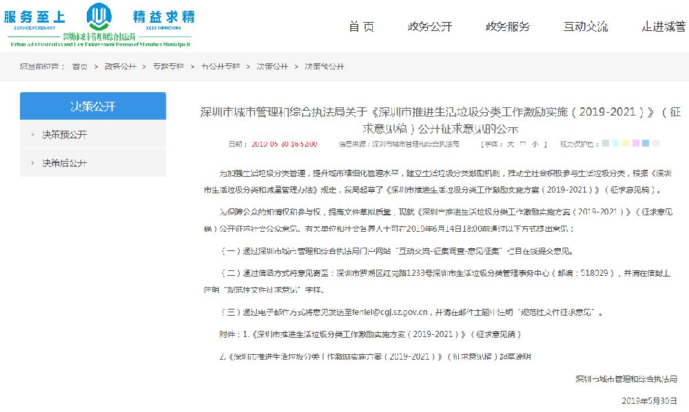 近日,深圳市城市管理和綜合執(zhí)法局網(wǎng)站發(fā)布關(guān)于《深圳市推進(jìn)生活垃圾分類工作激勵實(shí)施方案(2019-2021)》(征求意見稿)公開征求意見的公示,2019-2021年期間,深圳市每年安排生活垃圾分類激勵補(bǔ)助資金9375萬元,其中,各區(qū)財政共承擔(dān)6250萬元,市財政安排3125萬元。生活垃圾分類積極個人資金補(bǔ)助為1000元。