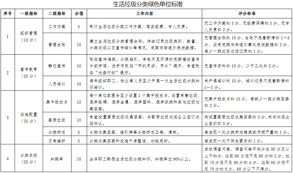 “生活垃圾分類綠色單位”指開展生活垃圾分類且成效顯著的黨政機(jī)關(guān)、事業(yè)單位、學(xué)校、企業(yè)和社會組織,應(yīng)具備以下條件: