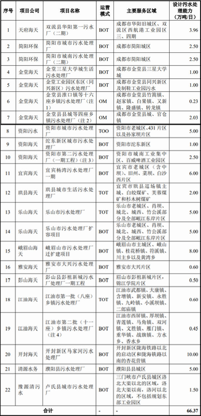 污水處理業(yè)務(wù)主要集中在四川省成都市雙流區(qū)、簡陽市、金堂縣、資陽市、宜賓市及所屬珙縣、樂山市、峨眉山市、雅安市、眉山市彭山區(qū)、巴中市平昌縣、江油市等地。
