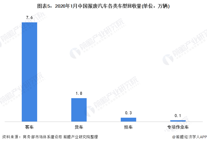 2020年1月,全國機動車回收數(shù)量12.0萬輛,按照車輛類型分,2020年1月份,客車回收數(shù)量為7.6萬輛,較2019年同期減少34.1%。貨車1.8萬輛,較2019年同期減少46.7%。掛車0.3萬輛,較2019年同期減少1.0%。專項作業(yè)車0.1萬輛,較2019年同期減少43.4%。