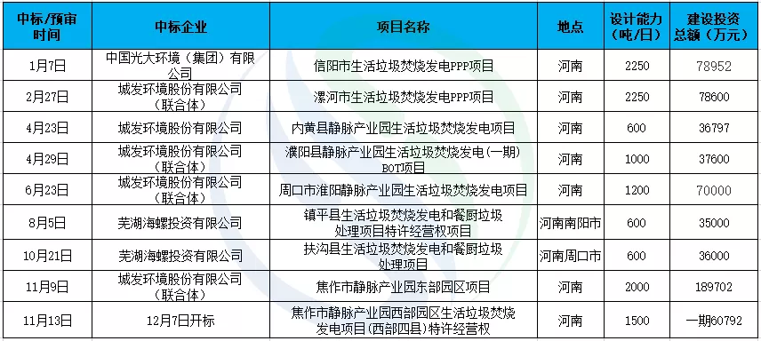 從中標(biāo)企業(yè)來看,康恒環(huán)境、光大環(huán)境、綠色動力、首創(chuàng)環(huán)境都是固廢十大影響力企業(yè),而城發(fā)環(huán)境作為平臺型國企,從去年進入固廢市場以來,“高歌猛進”不斷獲取生活垃圾焚燒項目,今年更是“火力全開”。粗略統(tǒng)計,2020年河南省至少釋放出9個垃圾焚燒項目,除信陽市、南陽市鎮(zhèn)平縣、周口市扶溝縣項目以及尚未開標(biāo)的焦作市西部園區(qū)項目之外,全被城發(fā)環(huán)境所斬獲,總投資金額突破41億元,處理規(guī)模達(dá)7050噸/日,始終牢牢占據(jù)著河南省成交垃圾焚燒項目量的前列。