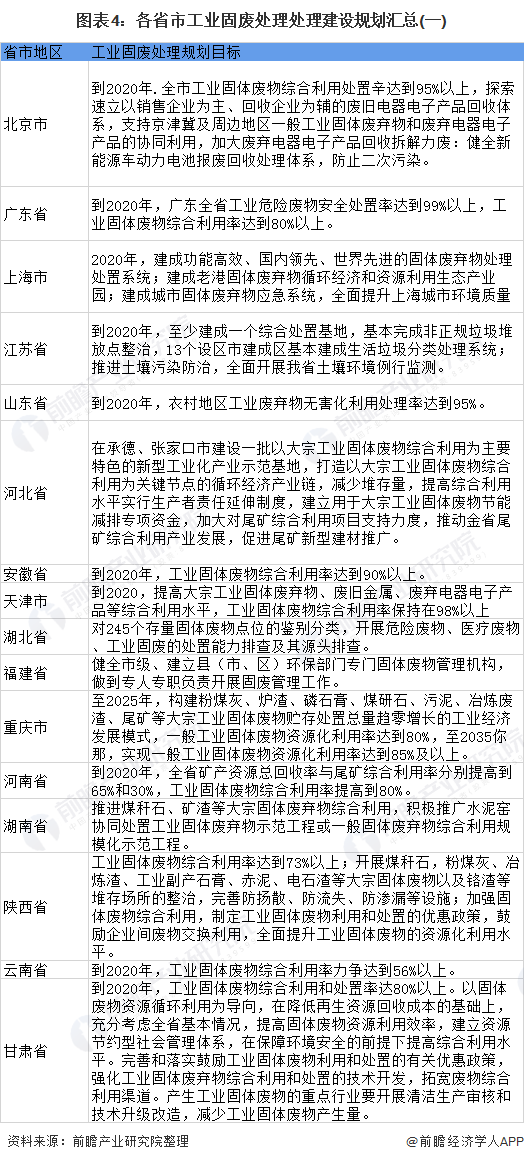 根據(jù)前瞻產(chǎn)業(yè)研究院匯總,截至2020年12月我國(guó)已經(jīng)有30多個(gè)省市地區(qū)就工業(yè)固廢處理的發(fā)展給出了相關(guān)的指導(dǎo)意見以及配套的措施,其中19個(gè)省份均已制定工業(yè)固廢處理綜合利用率階段性目標(biāo),并陸續(xù)出臺(tái)具體細(xì)化的地方性工業(yè)固廢處理政策扶持行業(yè)發(fā)展。