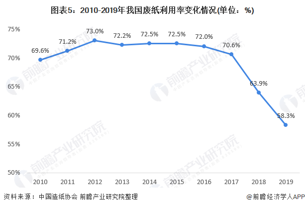 近年來廢紙一直是支撐我國造紙工業(yè)發(fā)展的重要纖維原料,隨著我國造紙原料結構的不斷調整,雖然廢紙漿使用率在2014年以后逐年下降。2011-2017年,我國廢紙利用率均高于70%,到2019年,我國廢紙利用率已跌至58.3%。