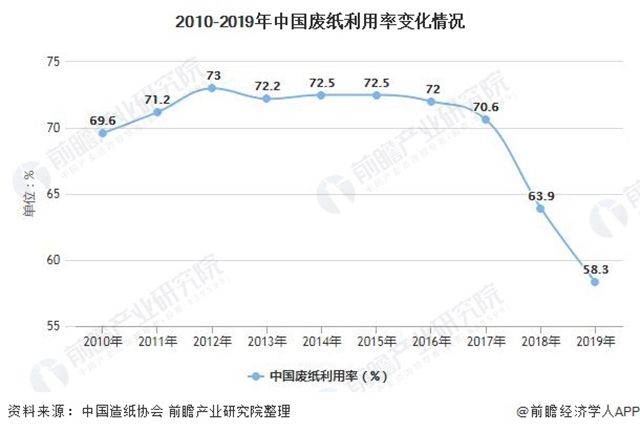 近年來廢紙一直是支撐我國造紙工業(yè)發(fā)展的重要纖維原料,隨著我國造紙原料結(jié)構(gòu)的不斷調(diào)整,雖然廢紙漿使用率在2014年以后逐年下降。2011-2017年,我國廢紙利用率均高于70%,到2019年,我國廢紙利用率已跌至58.3%。