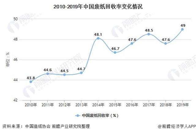 但近年來,隨著國民環(huán)保意識的調(diào)高和垃圾分類的推廣,我國廢紙回收率波動上升,2019年,我國廢紙回收率達(dá)到49.0%,實(shí)現(xiàn)10年間廢紙回收率的新高。