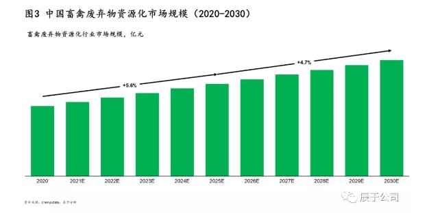 考慮到我國畜禽廢棄物綜合利用率已達75%,且大型畜禽養(yǎng)殖場已基本完成畜禽廢棄物資源化利用工作,辰于預(yù)計這一市場的未來增速將相較“十三五”有所放緩。假設(shè)2025年畜禽廢棄物綜合利用率達到80%以上,2030年達到85%以上,我們預(yù)計畜禽廢棄物資源化利用市場規(guī)模在2025年、2030年將分別達到1640億元、2064億元,期間年復(fù)合增長率分別為5.6%、4.8%(如圖3)。盡管增速一般,但規(guī)模不小,同時畜禽廢棄物資源化利用作為鄉(xiāng)村生態(tài)振興、污水資源化利用與碳中和碳達峰的工作重點,不容忽視。