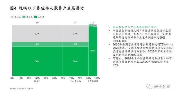 實現(xiàn)以上提到的目標(到2025年畜禽廢棄物綜合利用率達到80%),我們估算中小型養(yǎng)殖場與養(yǎng)殖散戶的畜禽糞污綜合利用率需從當前的58%提升至67%(如圖4,假設(shè)中國畜禽養(yǎng)殖場比例與中國畜牧協(xié)會統(tǒng)計生豬出欄比例相同[1]),中小型養(yǎng)殖場與養(yǎng)殖散戶將成為未來發(fā)展重點。