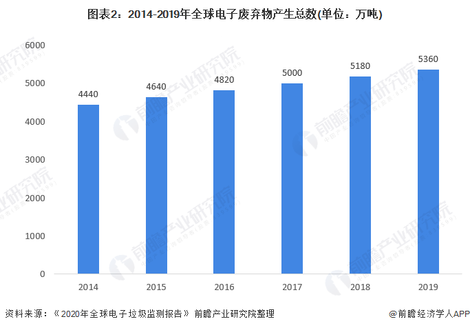 《2020年全球電子垃圾監(jiān)測(cè)報(bào)告》顯示,自2014年以來,電子廢棄物的總產(chǎn)生量逐年增長(zhǎng),至2019年增加了920萬噸,每年增長(zhǎng)近200萬噸,2019年產(chǎn)生了約5360萬噸電子廢棄物(不包括光伏電池板)。