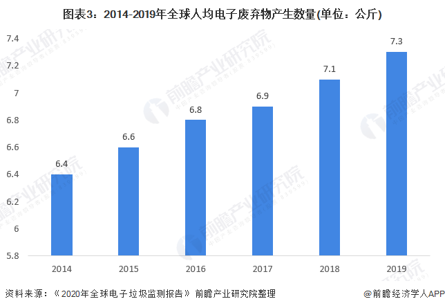 從人均電子廢棄物產(chǎn)生量上看,2014年以來,全球人均電子廢棄物產(chǎn)生量逐年增長(zhǎng),2014年,全球人均電子廢棄物產(chǎn)生量為6.4公斤,至2019年達(dá)7.3公斤,較2014年增長(zhǎng)0.9公斤。
