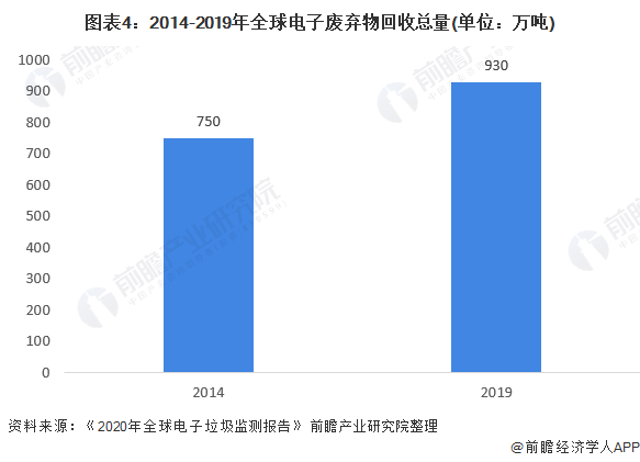 2019年,得到正式記錄的收集和回收利用量為930萬噸,為所產(chǎn)生電子廢棄物的17.4%。自2014年以來,電子廢棄物回收量增長(zhǎng)180萬噸,年均增長(zhǎng)近40萬噸。然而,電子廢棄物的總產(chǎn)生量增加了920萬噸,每年增長(zhǎng)近200萬噸。因此,電子廢棄物回收活動(dòng)全然趕不上其在全球的增長(zhǎng)速度。
