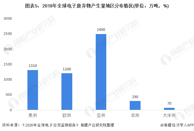 從區(qū)域分布上看,2019年,大部分電子廢棄物產(chǎn)生于亞洲,2019年亞洲電子廢棄物產(chǎn)生量達(dá)2490萬噸;其次為美洲,電子廢棄物產(chǎn)生量達(dá)1310萬噸。