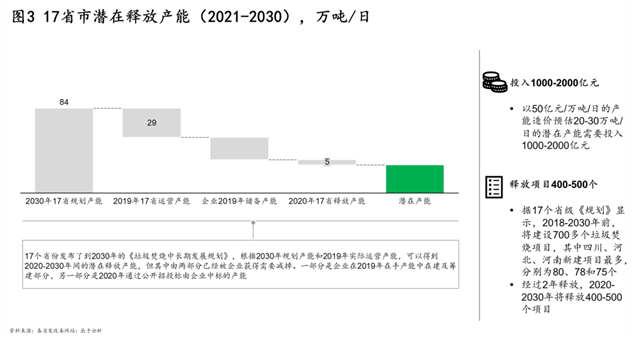 截至當前,已有17個省市發(fā)布了垃圾焚燒中長期發(fā)展規(guī)劃,根據(jù)這些省市到2030年的相關(guān)產(chǎn)能規(guī)劃,未來10年仍將有20~30萬噸/日的新增產(chǎn)能,釋放項目400~500個,投資規(guī)模1000~2000億元(見圖3)。而如果放眼全國,這三個數(shù)字只會更大。這一體量不容小覷,相當于當前行業(yè)排名第2-9位企業(yè)的在手產(chǎn)能之和,釋放的項目數(shù)量則相當于過去3年的全部開標項目數(shù)量。
