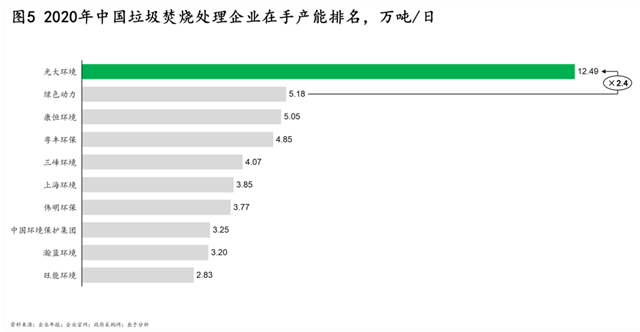當前,我國垃圾焚燒處理市場呈現(xiàn)“一枝獨秀”的競爭格局:處于領(lǐng)先地位的光大環(huán)境,連續(xù)多年排名第一,截至2020年底,在手產(chǎn)能[2]12.49萬噸/日,是排在第二位的綠色動力5.18萬噸/日的2.4倍,優(yōu)勢十分明顯,而排在第2-9位的企業(yè),在手產(chǎn)能大多在3-5萬噸/日左右,實力相當,差距不大(見圖5)。