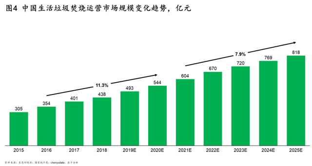 回顧“十三五”,伴隨垃圾焚燒項目投建的突飛猛進,運營市場同樣快速增長,期間年復合增長率11.3%,到2020年運營規(guī)模達到544億元。展望“十四五”,在人均垃圾產(chǎn)生量以及垃圾焚燒比例持續(xù)上升的有利驅(qū)動下,我們預計垃圾焚燒運營規(guī)模仍將保持7.9%的年復合增速,到2025年達到818億元(見圖4)。隨著行業(yè)監(jiān)管日趨嚴格,部分企業(yè)包括政府投資項目在技術(shù)、運營方面能力不足問題凸顯,這為行業(yè)內(nèi)優(yōu)質(zhì)企業(yè)在運營管理對外服務提供了“輕資產(chǎn)化”的廣闊商機。