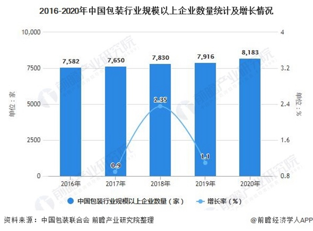 根據(jù)中國包裝聯(lián)合會統(tǒng)計數(shù)據(jù)顯示,2016-2019年,我國包裝行業(yè)規(guī)模以上企業(yè)數(shù)量(年主營業(yè)務(wù)收入2000萬元及以上全部工業(yè)法人企業(yè))呈穩(wěn)步上升的趨勢。2019年中國包裝行業(yè)規(guī)模以上企業(yè)數(shù)量達(dá)7916家,同比增長1.10%。截止至2020年中國包裝行業(yè)規(guī)模以上企業(yè)數(shù)量達(dá)到8183家,企業(yè)數(shù)比去年增加267家。反映出行業(yè)入局者逐漸增多,市場競爭日益激烈。
