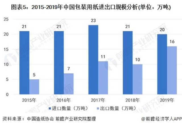 根據(jù)中國造紙協(xié)會資料,2015-2019年中國包裝用紙進(jìn)口數(shù)量較為穩(wěn)定,保持在20-23萬噸之間,出口數(shù)量逐年上升,貿(mào)易逆差逐漸縮小,到2019年中國包裝用紙進(jìn)口數(shù)量為20萬噸,出口規(guī)模為16萬噸。