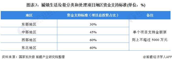 資金支持標(biāo)準(zhǔn)中有城鎮(zhèn)生活垃圾分類和處理項(xiàng)目,按東、中、西和東北地區(qū)分別不超過項(xiàng)目總投資的30%、45%、60%、60%控制,單個(gè)項(xiàng)目支持金額原則上不超過5000萬(wàn)元,重大創(chuàng)新示范項(xiàng)目除外。