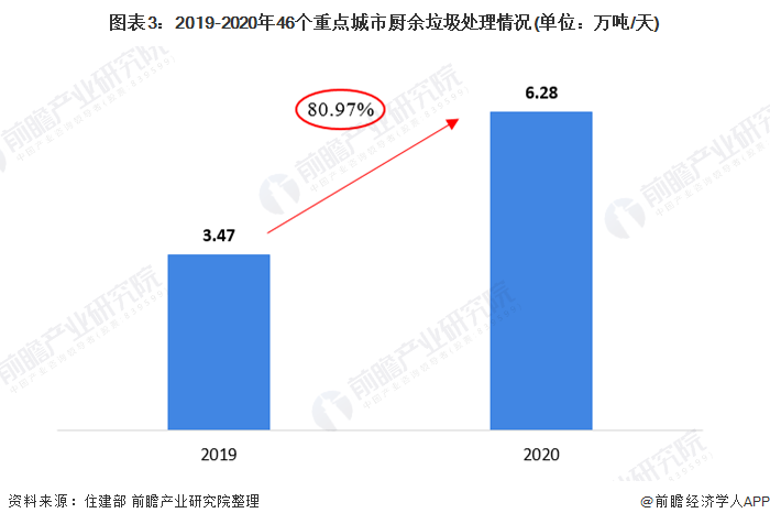 2020年12月4日,住建部召開新聞通氣會,就《進(jìn)一步推進(jìn)生活垃圾分類工作的若干意見》(以下簡稱《意見》)進(jìn)行政策解讀。住建部介紹,我國46個(gè)重點(diǎn)城市廚余垃圾處理能力已從2019年的3.47萬噸/天,提升到6.28萬噸/天,年提升率為80.97%。