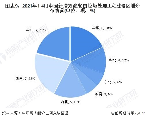 按區(qū)域分布來看,2021年1-4月,我國已披露的新增籌建的餐廚垃圾處理項目主要分布在華中地區(qū)和西南地區(qū),數(shù)量均為7項,合計占比全國新增數(shù)量的43%。