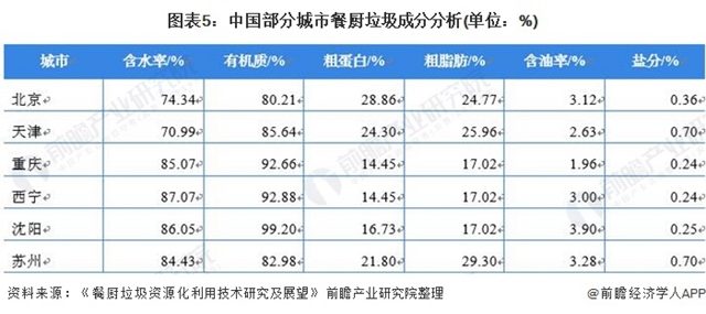 值得一提的是,在南京大學(xué)和香港浸會大學(xué)發(fā)表的論文《餐廚垃圾資源化利用技術(shù)研究及展望》中發(fā)現(xiàn),中國不同城市的餐廚垃圾的性質(zhì)有一定的差異,原因很可能是和當(dāng)?shù)氐纳詈惋嬍沉?xí)慣有關(guān);因此在資源化利用的過程中,不同的城市的餐廚垃圾中各組分特點應(yīng)被充分考慮,在選擇垃圾處理技術(shù)時選擇最適合的處理方法。