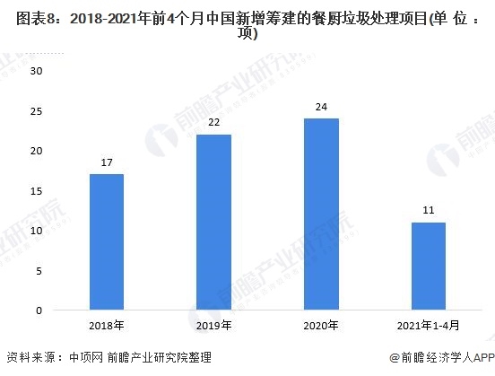 由于2020年疫情的特殊情況,僅比較2019年和2021年的情況來看,2021年1-4月,我國新增籌建的餐廚垃圾處理項目已經(jīng)有11項,相當(dāng)于已達(dá)到2019年新增籌建項目的50%。