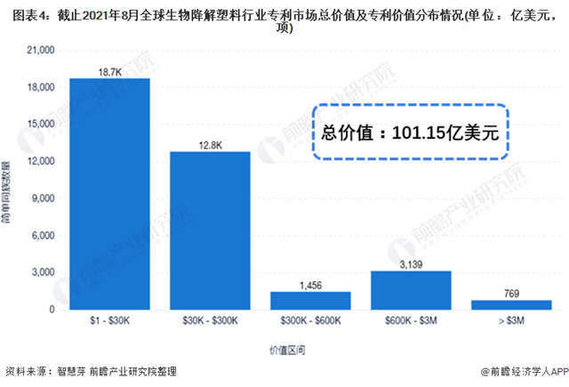 目前,全球生物降解塑料行業(yè)專利總價(jià)值為100.79億美元。其中,3萬美元以下的生物降解塑料專利申請數(shù)量最多,為18735項(xiàng);其次是3萬-30萬美元的生物降解塑料專利,合計(jì)專利申請量為12812項(xiàng)。3百萬美元以上的生物降解塑料專利申請數(shù)量最少,為769項(xiàng)。
