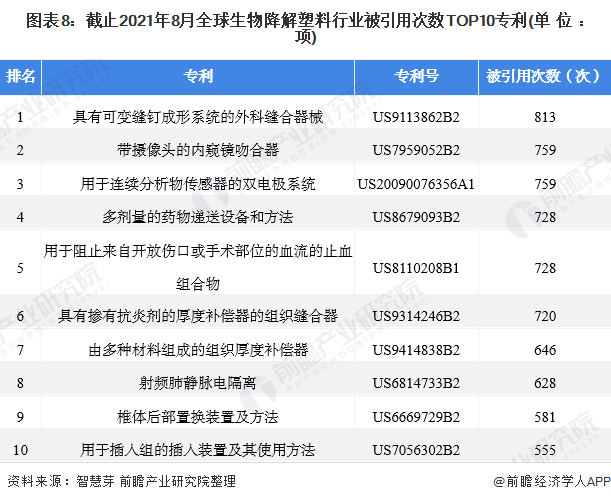 具有可變縫釘成形系統(tǒng)的外科縫合器械(專利號(hào):US9113862B2)、帶攝像頭的內(nèi)窺鏡吻合器(專利號(hào):US7959052B2)和用于連續(xù)分析物傳感器的雙電極系統(tǒng)(專利號(hào):US20090076356A1)是被引用次數(shù)最多的三大生物降解塑料專利,三者被引用次數(shù)均超過750次。其它被引用次數(shù)前十大專利如下所示: