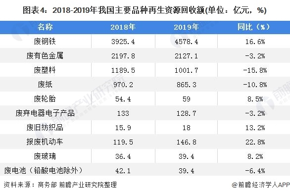 2019年,我國十大品種再生資源回收總額為9003.8億元,同比增長3.7%。2020年十大品種再生資源回收總額約為10420億元。
