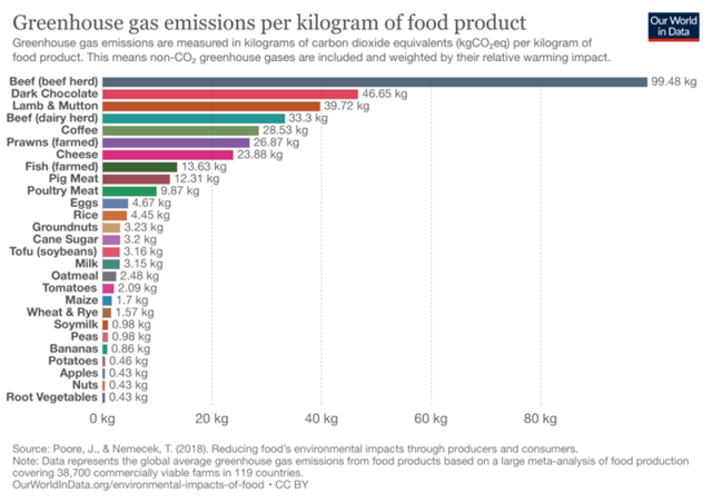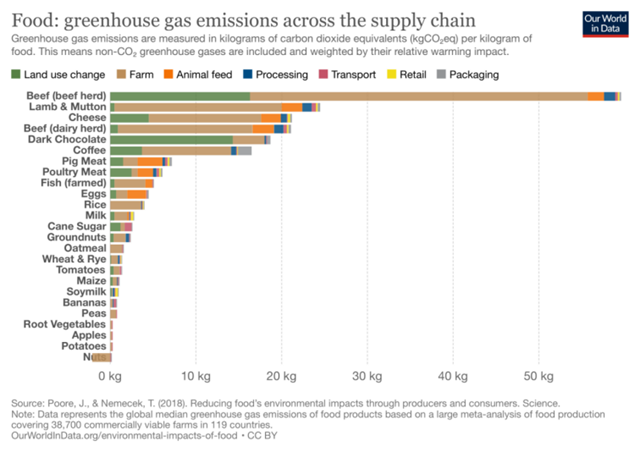 據(jù)牛津大學開發(fā)的Our World in Data平臺中,我們從中選取了一些中國人經常食用的食品種類,統(tǒng)計后得出下圖,位于圖表底部的多是水果與植物性食物,它們的碳排放普遍偏低,比動物性食物低10至50倍。其次是糖,牛奶,雞蛋,家禽等。碳排放較高的是黑巧克力,咖啡以及肉類。由下往上最終我們看到,位列碳排放之首的是牛肉,遠遠超出其它各項食品。可以看出,那些經過最少加工且對人體健康益處大的食物通常對環(huán)境的危害也很小,比如谷物,水果,蔬菜,豆類,堅果,橄欖油等食品。相反,紅肉等具有高疾病風險的食物對環(huán)境影響也是最大的。同樣的,加工過程復雜的一些食品比如咖啡和巧克力等則對健康有害的同時也會對環(huán)境造成不良影響。由此可見,飲食健康也意味著可持續(xù)健康。(圖3)