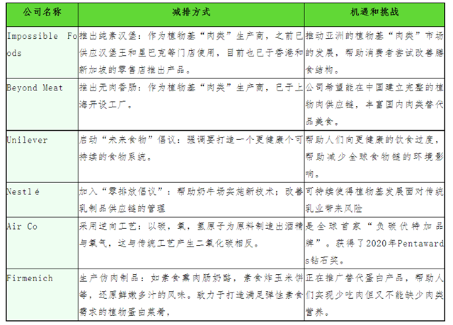 在企業(yè)產品管理方面,企業(yè)通過打造“未來膳食”理念,改變人們的傳統(tǒng)飲食結構,通過現(xiàn)代化的食品生產系統(tǒng),如“人造肉”降低食品生產階段的碳排放。例如Beyond Meat公司,計劃在中國建立完整的植物肉供應鏈,豐富國內肉類替代品美食。除此以外,Unilever啟動“未來食物”倡議,強調要打造一個更健康的可持續(xù)的食物系統(tǒng),幫助人們向更健康的飲食過渡,幫助減少全球食物鏈的環(huán)境影響。雖然利用現(xiàn)在的食品生產技術可以實現(xiàn)“人造蛋白”等低碳替代食品規(guī)模生產,但其是否能被傳統(tǒng)消費者廣泛接受仍然需要證實。