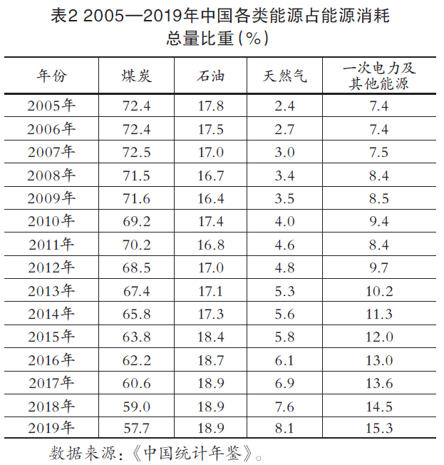 近年來,中國(guó)一次能源消費(fèi)結(jié)構(gòu)呈現(xiàn)出明顯的低碳化、清潔化趨勢(shì)(見表2)。2005—2019年煤炭消費(fèi)量比重從72.4%下降至57.7%,共下降14.7個(gè)百分點(diǎn);天然氣消費(fèi)量則從2.4%提高到8.1%,清潔能源(一次電力及其他能源)消費(fèi)量從7.4%提高到15.3%,合計(jì)占比提高13.6個(gè)百分點(diǎn)。
