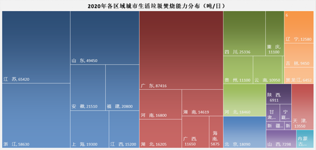 如果從無害化處理能力來看,又是另一番景象。廣東、山東、江蘇、浙江四省無害化處理能力仍然領(lǐng)跑,其中垃圾焚燒處理能力分別達(dá)到87416噸/日、49450噸/日、65420噸/日、58630噸/日??梢钥吹脚判蚵杂凶兓?,江蘇、浙江的垃圾焚燒處理能力高于山東省,推算如果論平均單體垃圾焚燒項(xiàng)目規(guī)模,江蘇和浙江省高于山東省。數(shù)據(jù)中還可以看到,這幾個省份是大力發(fā)展生活垃圾焚燒的省份,不僅焚燒廠建得多,而且垃圾焚燒日處理能力和處理量也處在突出高位。