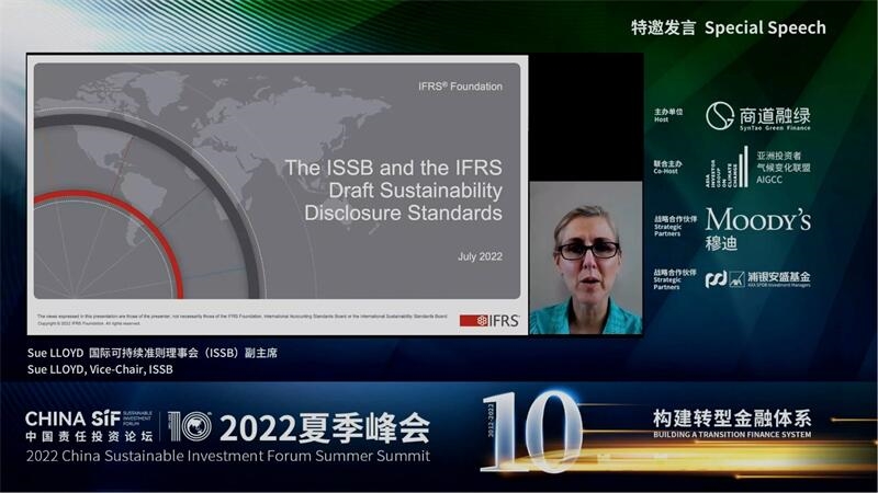 隨后,國(guó)際可持續(xù)準(zhǔn)則理事會(huì)(ISSB)副主席Sue LLOYD做了特邀發(fā)言。她介紹,ISSB由國(guó)際財(cái)務(wù)報(bào)告準(zhǔn)則(IFRS)基金會(huì)在2021年第26屆聯(lián)合國(guó)氣候變化大會(huì)上發(fā)起,旨在制定統(tǒng)一的可持續(xù)發(fā)展報(bào)告準(zhǔn)則。她分享了ISSB近期發(fā)布的兩份可持續(xù)披露準(zhǔn)則文件征求意見稿的主要內(nèi)容,即《國(guó)際財(cái)務(wù)報(bào)告可持續(xù)披露準(zhǔn)則第1號(hào)——可持續(xù)相關(guān)財(cái)務(wù)信息披露一般要求(征求意見稿)》和《國(guó)際財(cái)務(wù)報(bào)告可持續(xù)披露準(zhǔn)則第2號(hào)——氣候相關(guān)披露(征求意見稿)》,并呼吁大家在七月底之前積極提供反饋。
