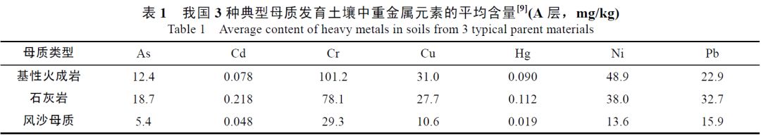 20世紀(jì)80年代進(jìn)行的中國土壤元素背景值調(diào)查結(jié)果表明,不同類型母質(zhì)上發(fā)育的土壤,其重金屬含量的差異很大,如As、Cd、Cr、Cu、Hg、Ni和Pb等元素在基性火成巖和石灰?guī)r母質(zhì)發(fā)育的土壤中的平均含量大大高于風(fēng)沙母質(zhì)土壤。
