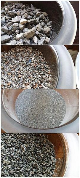 回收后的裝修垃圾,通過機(jī)器分揀處理,可以生產(chǎn)出不同的原料,自上而下,依次是:大顆粒骨料、小顆粒骨料、粉末骨料和塑料顆粒