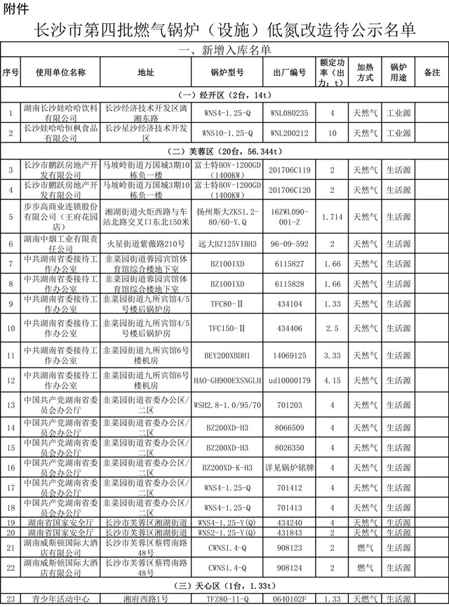 2020年6月,根據(jù)《長沙市燃氣鍋爐(設(shè)施)低氮改造工作補充通知》要求,市藍天辦進行了第四批次燃氣鍋爐(設(shè)施)低氮改造待公示名單征集,經(jīng)各區(qū)縣上報統(tǒng)計,此批次共減少29臺鍋爐、蒸噸數(shù)下調(diào)94.486蒸噸,調(diào)整鍋爐用途3臺(3蒸噸)(詳見附件),最終確定全市應(yīng)改造鍋爐為1144臺(具體詳見附件)。 附...