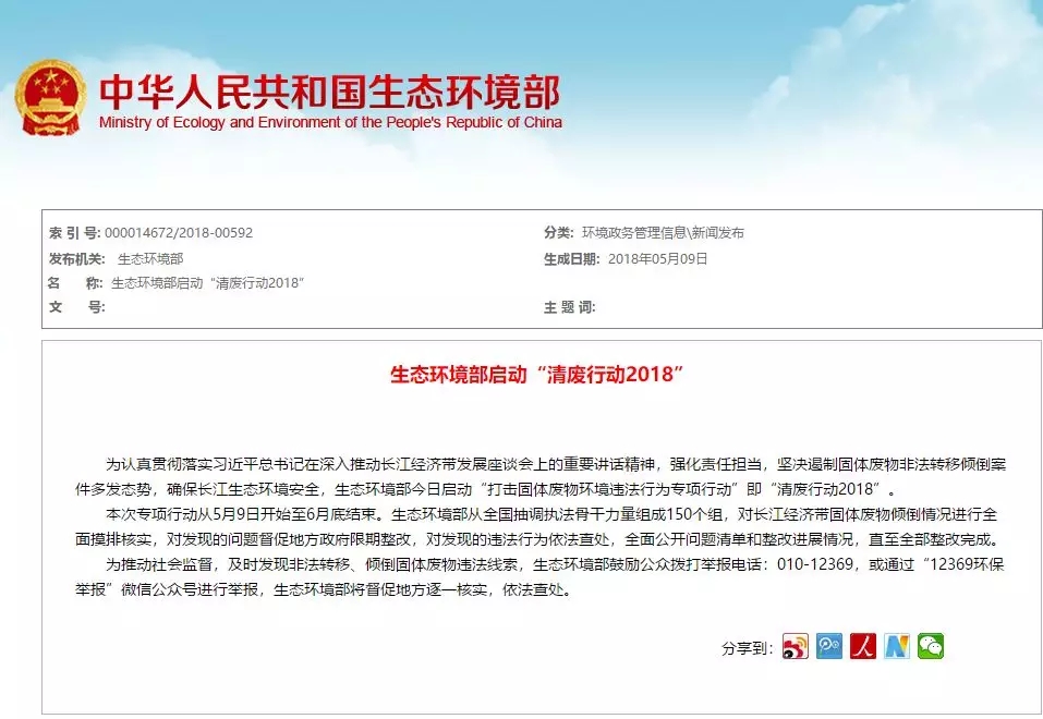 為遏制長江流域固體廢物非法轉(zhuǎn)移傾倒案件多發(fā)態(tài)勢,及時消除環(huán)境安全隱患,保障長江生態(tài)環(huán)境安全,生態(tài)環(huán)境部決定組織開展打擊固體廢物環(huán)境違法行為專項(xiàng)行動。從有關(guān)?。▍^(qū)、市)環(huán)保系統(tǒng)抽調(diào)人員,組成150個專項(xiàng)行動督查組,對長江經(jīng)濟(jì)帶11省(市)1400多個固體廢物堆存點(diǎn)位進(jìn)行現(xiàn)場核查督導(dǎo)。這場名為“清廢行動...
