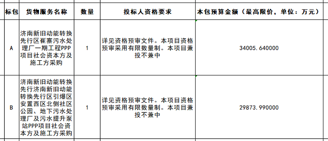 近日,中國(guó)政府采購(gòu)網(wǎng)發(fā)布山東省濟(jì)南市先行區(qū)污水處理廠PPP項(xiàng)目社會(huì)資本方及施工方采購(gòu)資格預(yù)審公告,采購(gòu)項(xiàng)目共2個(gè),A標(biāo)包為濟(jì)南新舊動(dòng)能轉(zhuǎn)換先行區(qū)崔寨污水處理廠一期工程PPP項(xiàng)目社會(huì)資本方及施工方采購(gòu),預(yù)算金額34005.64萬元,B標(biāo)包為濟(jì)南新舊動(dòng)能轉(zhuǎn)換先行濟(jì)南新舊動(dòng)能轉(zhuǎn)換先行區(qū)引爆區(qū)安置西區(qū)北側(cè)社...