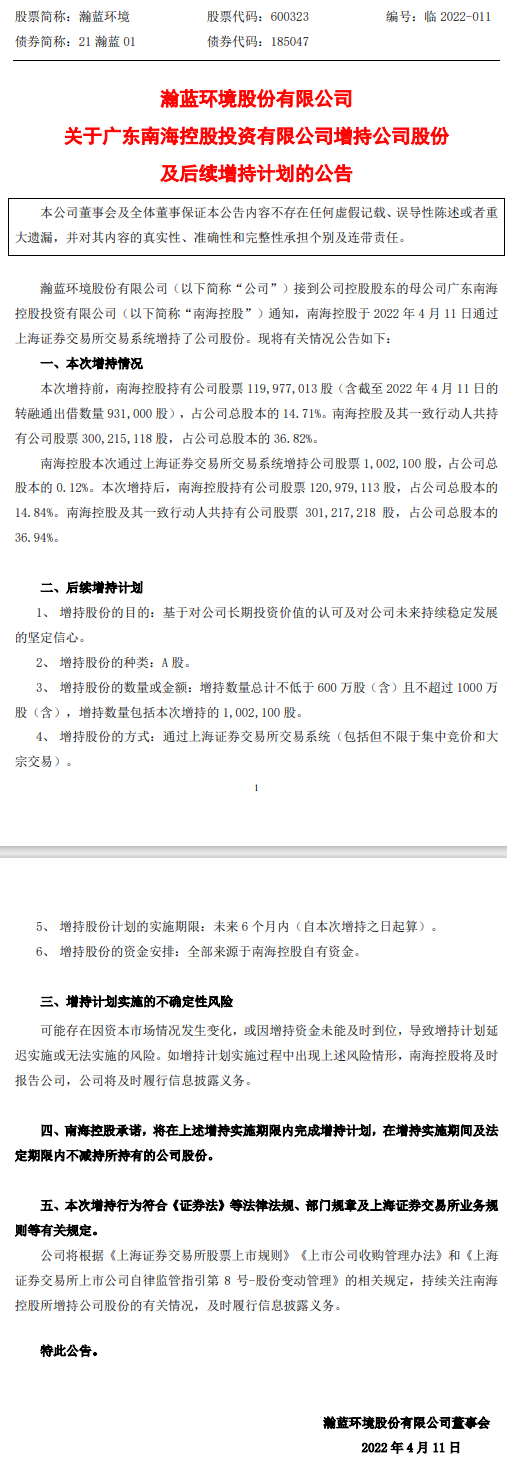 2022年4月11日,瀚藍環(huán)境股份有限公司(下稱“瀚藍環(huán)境”)發(fā)布公告稱,廣東南海控股投資有限公司(下稱“南??毓?rdquo;)已成功通過上海證券交易所交易系統(tǒng)增持了股份。 據了解,本次增持前,南??毓沙钟绣{環(huán)境14.71%的股份,及其一致行動人共持有瀚藍環(huán)境...